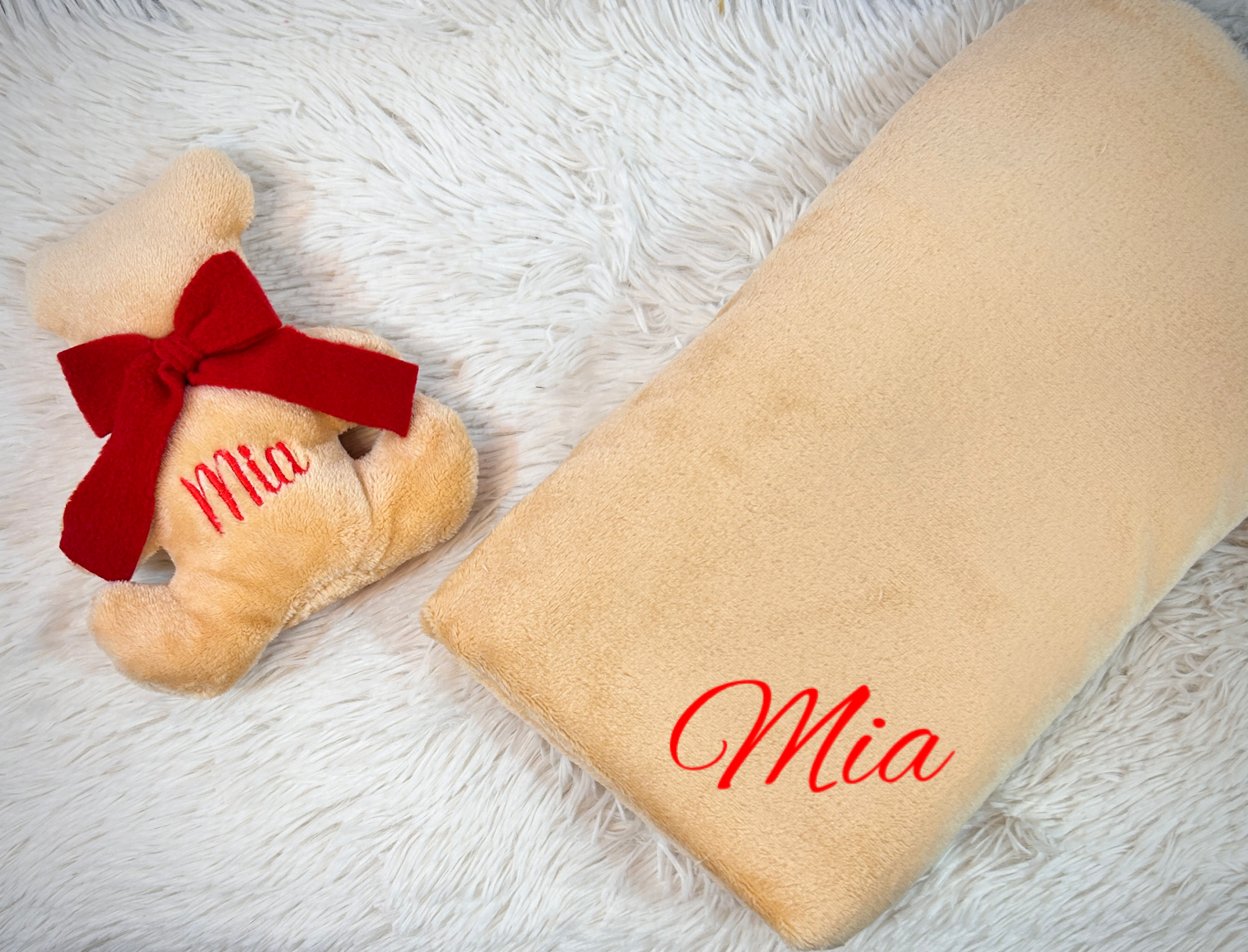 🛏️ Ćebe dimenzija 100×75 cm, savršeno mekano i praktično, takođe personalizovano imenom deteta.