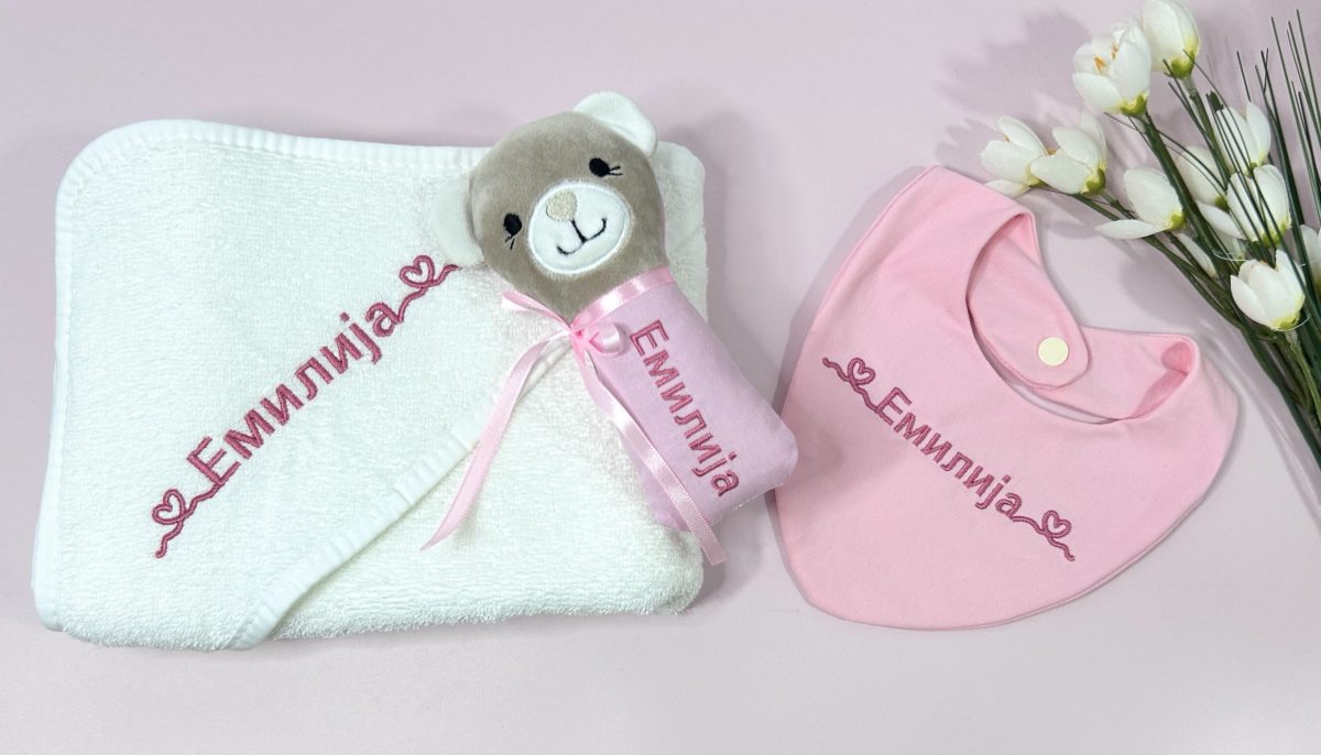 Poklon set- Srce- peškir sa kapuljačom 75x75cm- 100% pamuk, zvečka meda i pamučna portiklica.